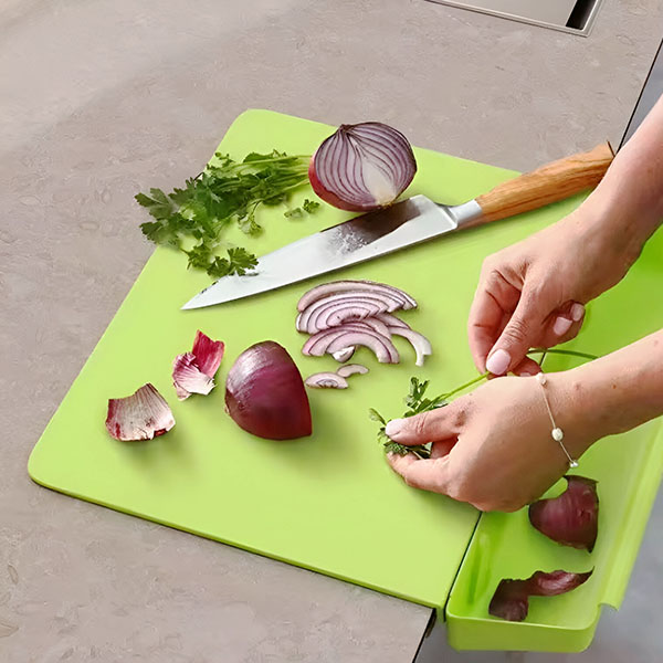 Udržujte své pracovní desky bez poskvrnky! Vestavěná odkládací přihrádka shromažďuje zbytky a nakrájené kousky, čímž eliminuje obvyklý nepořádek v kuchyni.