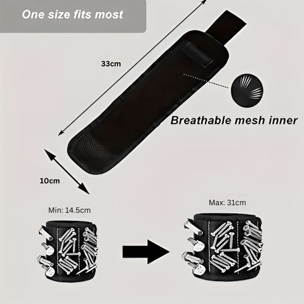 Silné magnety v tomto náramku snadno obepnou vaše zápěstí a udrží vám malé kovové předměty, jako jsou šrouby, hřebíky a svorníky, na dosah ruky.