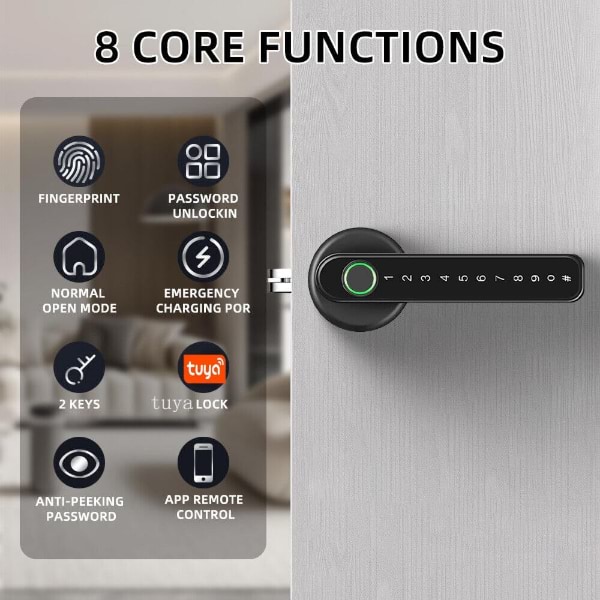Možnosti odemknutí: otisk prstu, mechanický klíč, heslo, mobilní aplikace (Tuya App), dočasné heslo.