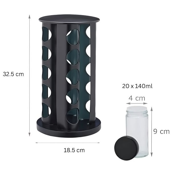 📦 Balení obsahuje: 1x Stojan na koření, 20x Skleněné dózy s černými vzduchotěsnými víčky.
