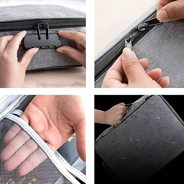 Máte obavy o bezpečnost svých důležitých dokumentů a cenností? Tato vodotěsná taška je vybavena bezpečným kódovým zámkem, který zajistí, že vaše dokumenty, peníze a šperky zůstanou pro ostatní nedostupné.