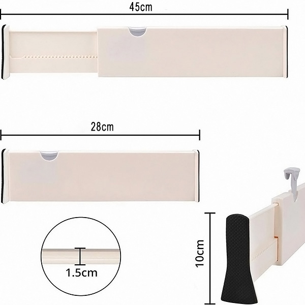 Ať už jde o kuchyňské náčiní, koupelnové potřeby nebo ponožky v ložnici, tyto přepážky se dají nastavit od 28 cm do 45 cm, aby se přizpůsobily většině zásuvek. Můžete si prostor upravit přesně podle svých potřeb.