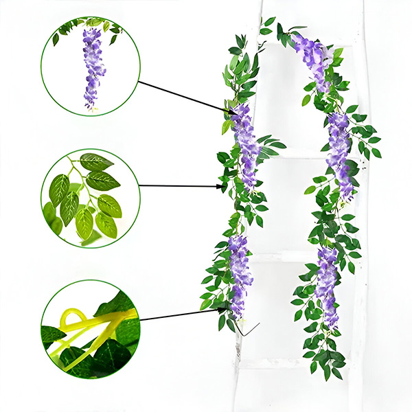 Nemusíte se zabývat liánami nebo květinami, které vadnou a uvadají. Naše simulace vistárie je vyrobena z vysoce kvalitního hedvábí a pružného plastu, což zajišťuje, že si navždy zachová svou vitalitu. Tyto odolné květiny jsou navrženy tak, aby vydržely, a poskytují vám krásné a trvalé řešení dekorace.